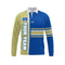 Design Your Own Custom Knitted Long Sleeve Jersey with Coast 2 Coast Sports. This design has traditional stripes around the abdomen and elbows. Easily change the colours and add logos on this example template. On the front you can upload your school emblem or mascot if you like. The back has a bigger blank area where you can put a big school name or team name, or the year number of your graduation just as an idea.